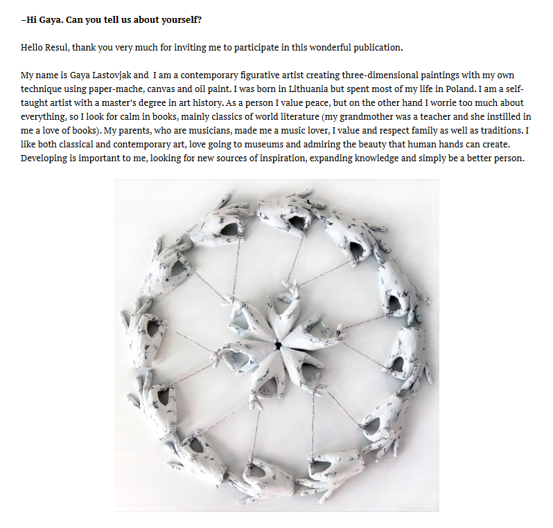 Przeprowadziliśmy przyjemny wywiad z Gayą Lastovjak, litewską artystką figuratywną mieszkającą w Polsce, na temat jej życia artystycznego.