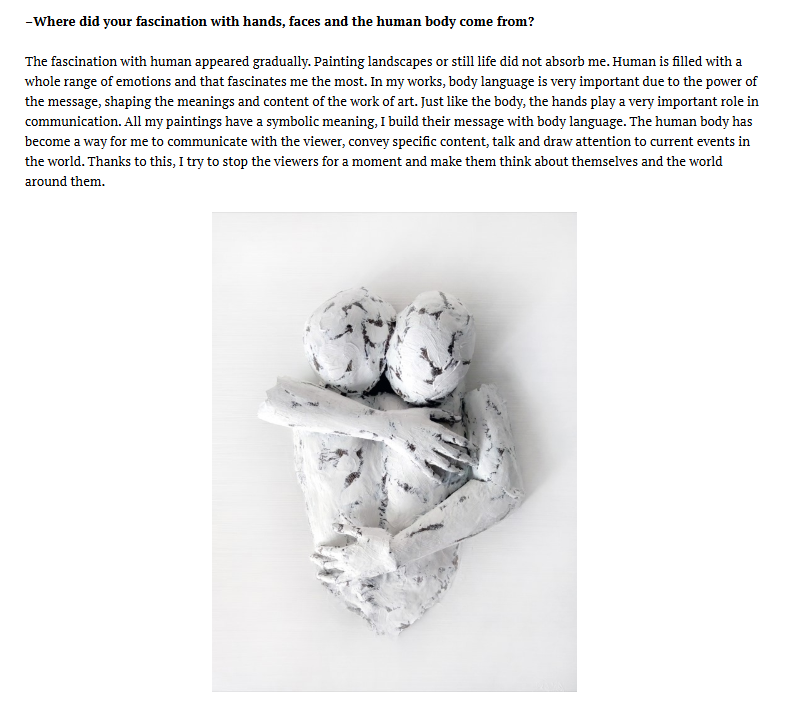 The fascination with human appeared gradually. Painting landscapes or still life did not absorb me. Human is filled with a whole range of emotions and that fascinates me the most. In my works, body language is very important due to the power of the message, shaping the meanings and content of the work of art. Just like the body, the hands play a very important role in communication. All my paintings have a symbolic meaning, I build their message with body language. The human body has become a way for me to communicate with the viewer, convey specific content, talk and draw attention to current events in the world. Thanks to this, I try to stop the viewers for a moment and make them think about themselves and the world around them.