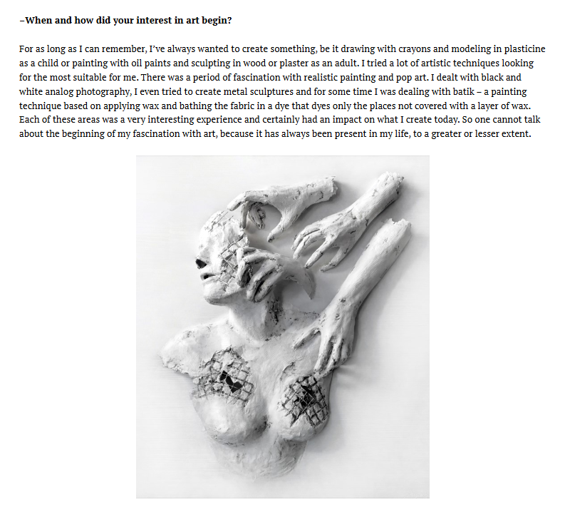 My name is Gaya Lastovjak and I am a contemporary figurative artist creating three-dimensional paintings with my own technique using paper-mache, canvas and oil paint. I was born in Lithuania but spent most of my life in Poland. I am a self-taught artist with a master’s degree in art history. As a person I value peace, but on the other hand I worrie too much about everything, so I look for calm in books, mainly classics of world literature (my grandmother was a teacher and she instilled in me a love of books). My parents, who are musicians, made me a music lover, I value and respect family as well as traditions. I like both classical and contemporary art, love going to museums and admiring the beauty that human hands can create. Developing is important to me, looking for new sources of inspiration, expanding knowledge and simply be a better person.